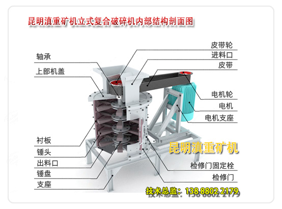 按照整個流程逆序啟動各個設備后,電機驅動立式復合破碎機中心軸、錘盤、錘頭高速轉動,物料由輸送機穩定、連續送入立式復合破碎機上部的進料口,在自身重力作用下進入復合式破碎機的內部破碎腔,與高速旋轉的錘頭發生碰撞發生沖擊式破碎效果,物料吸收沖量后高速反向撞向發生二次破碎,同時物料之間的碰撞也會形成多重破碎作用,在物料在錐形從上部進料口進入直到下落到下部的中隔板上的時間段內,這種往復的多重破碎高頻多次發生,最終形成符合要求的顆粒從下部出料口排出。下面的立式破碎機原理示意動畫看得會更直觀些: